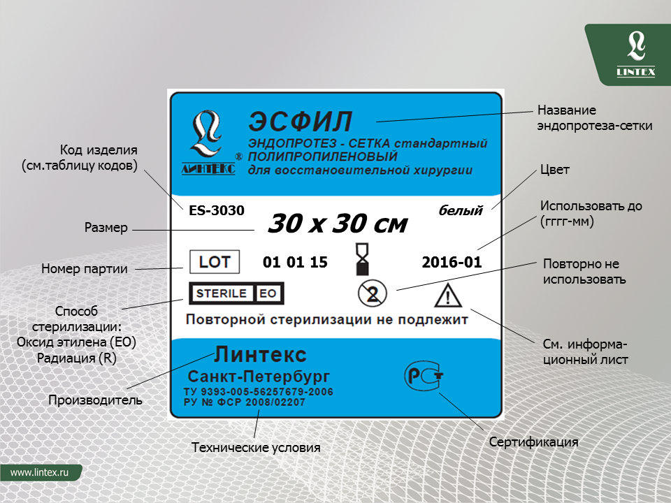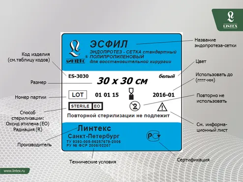 - Эндопротез-сетка полипропиленовый для восстановительной хирургии ЭСФИЛ® стандартный, Линтекс